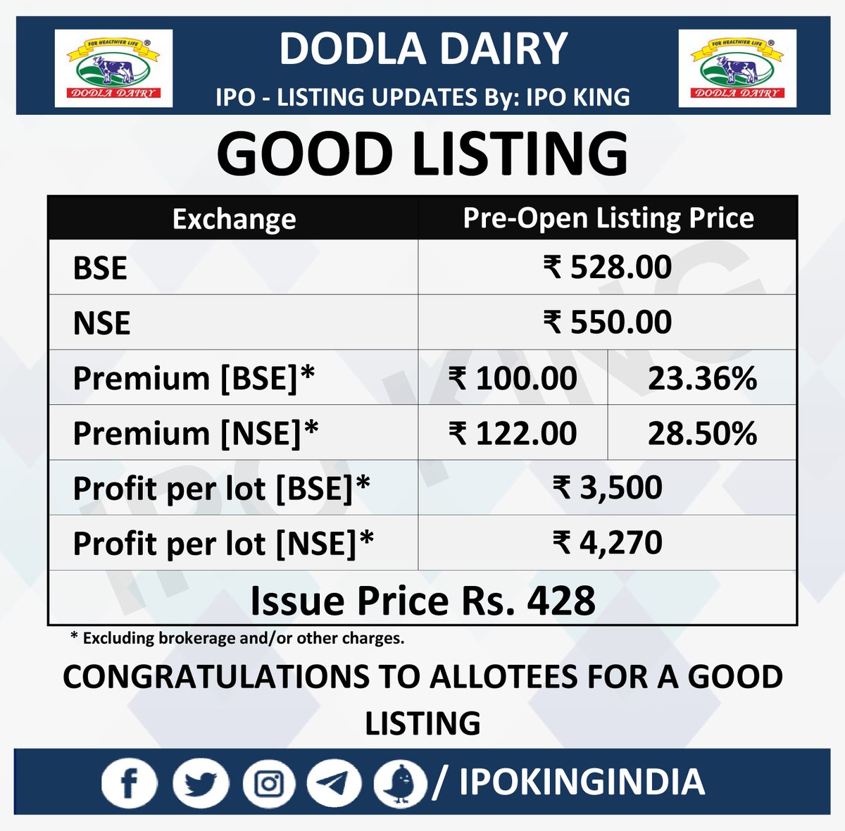 The shares of dodla dairy were trading at a premium of 35 per cent over the issue price at rs 575 on the bse and nse. Dodla dairy limited is a public limited company having its registered and corporate office at hyderabad city of telangana state in india. Dodla dairy allotment chances are discussed too. Check dodla dairy listing price, bse & nse code, isin number and more details. It has an average procurement of 1.02 million litres of milk. The shares were up rs 122 as compared to the issue dodla ipo details: Dodla dairy ltd is a leading dairy player in entire southern india region which has large product portfolio. The issue is priced at ₹421. The stock listed at rs 550, a 28 per cent premium over the issue price of rs 428 per share on the nse. Further, ddl has shown improvement in operating margin with an efficient working capital cycle. Dodla dairy limited ipo details. Shares of dodla dairy on monday jumped over 28 per cent in its debut trade against the issue price of rs 428. The company was incorporated in the year 1995 and production commenced in 1997.